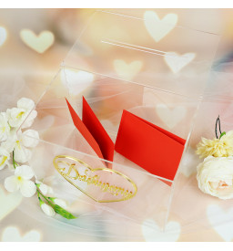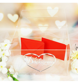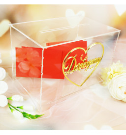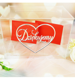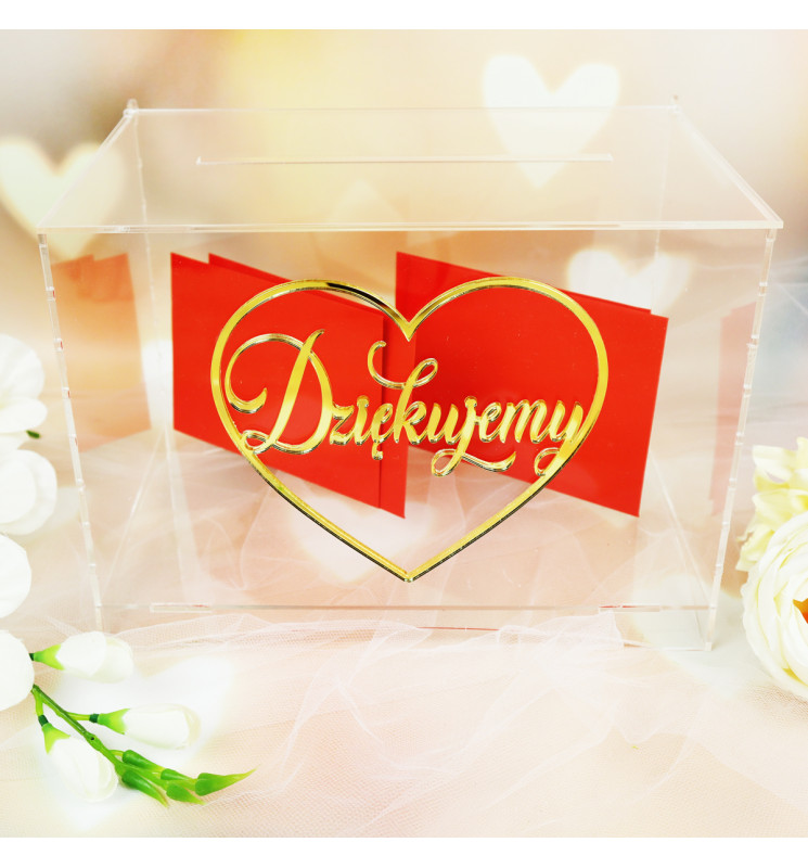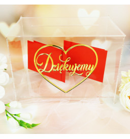 Skrzynia na koperty wykonana z przeźroczystej plexi o grubości 3 mm z złotym lub srebrnym sercem dziękujemy.