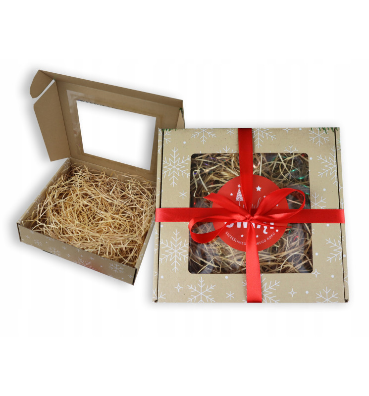 Pudełko świąteczne z okienkiem 200x200x50 mm z nadrukiem ŚNIEŻYNKI, wypełnieniem oraz kokardą