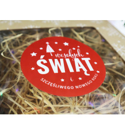- Naklejka z napisem Wesołych Świąt o średnicy 9 cm