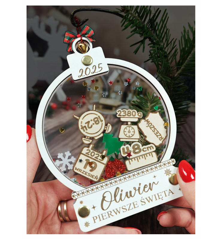Wyjątkowa, personalizowana bombka choinkowa stworzona z myślą o najmłodszych. To nie tylko ozdoba na choinkę, ale piękna pamiątka na długie lata, która będzie wzruszać przy każdych kolejnych świętach.