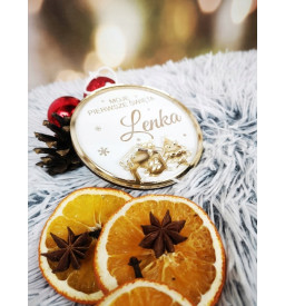 Bombka wykonana w nowoczesnym stylu z transparentnym tłem. Doskonały prezent na święta, która będzie również pamiątką dla rodziców.