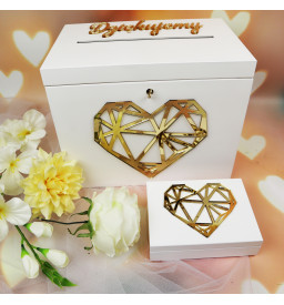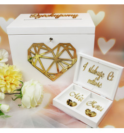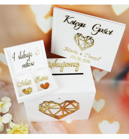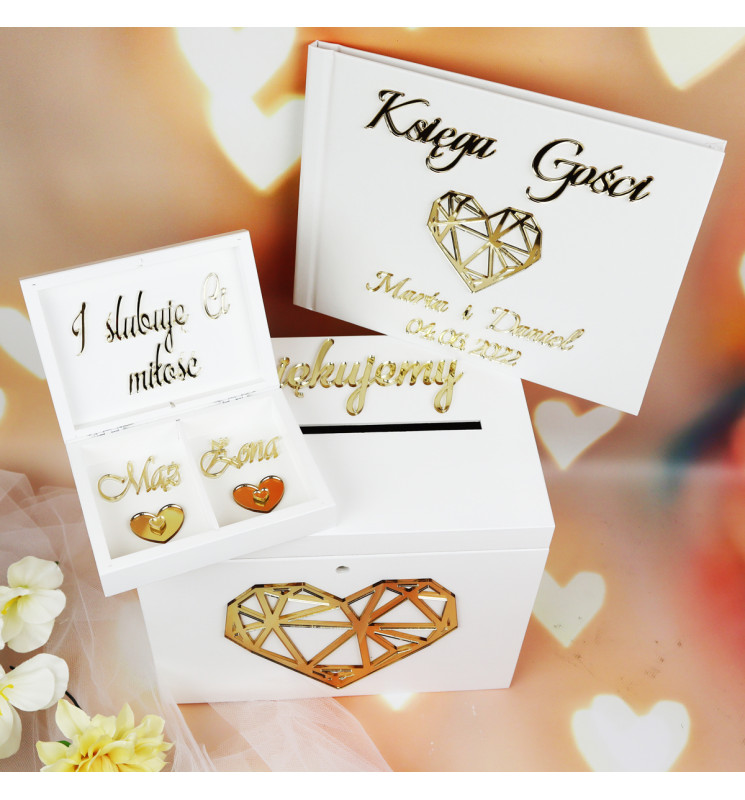 Zestaw ślubny: skrzynia na obrączki, koperty księga